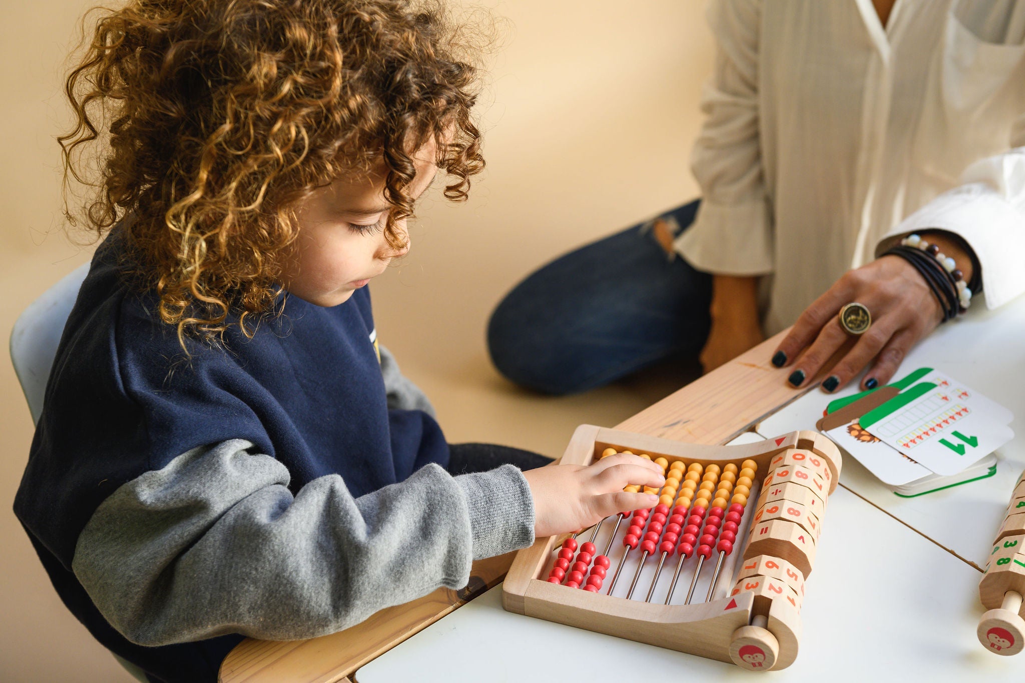 Children choose a card, match the number and equation wheels by color, present the problem, and solve it using the abacus - making math easier to understand and far more inviting.