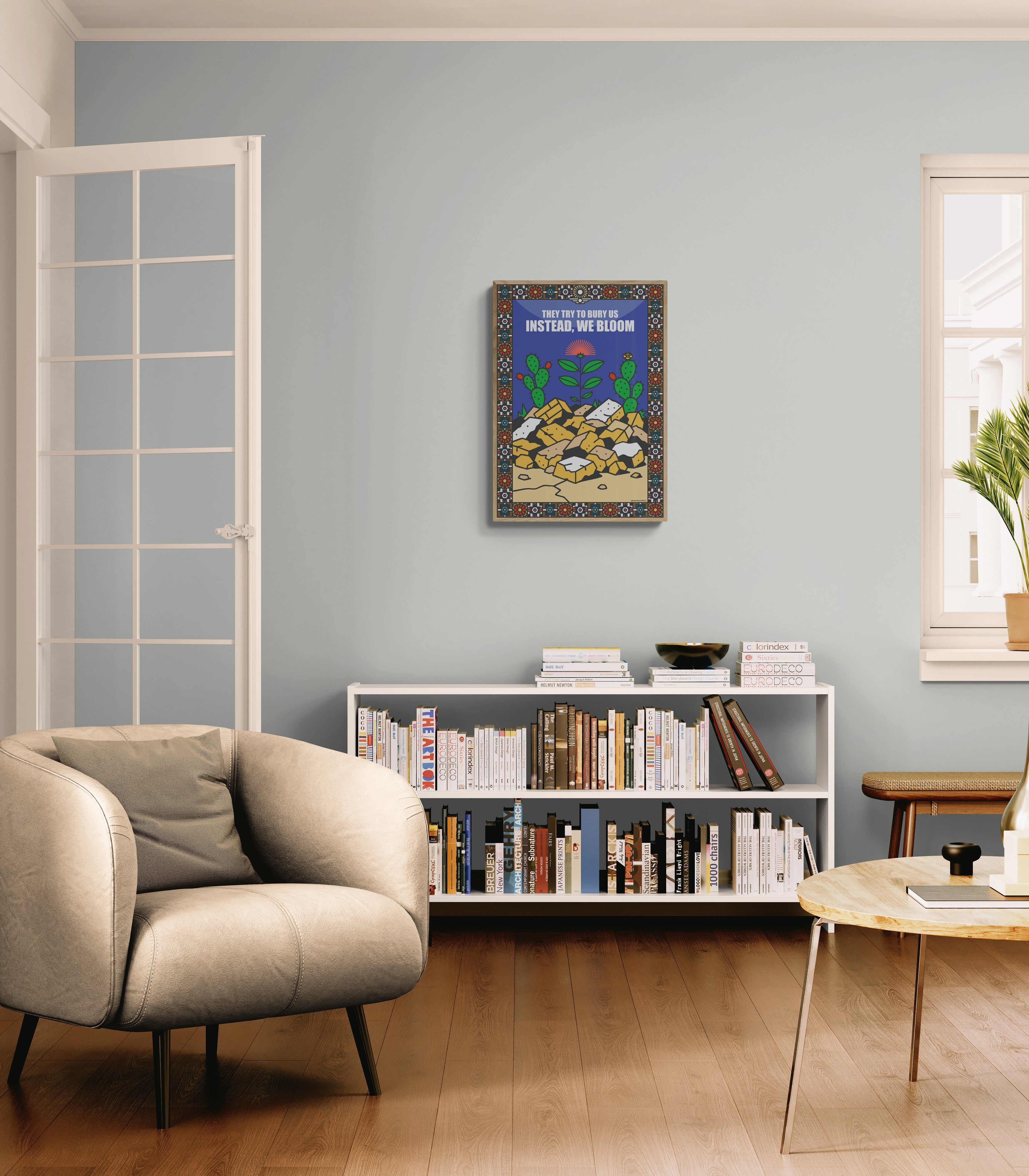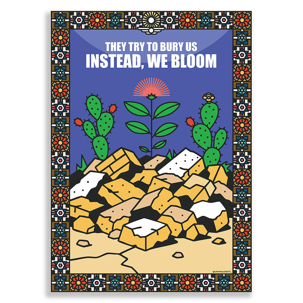 הטקסט שמופיע בראשו, "They try to bury us – instead, we bloom", מהדהד מסר אוניברסלי של תקווה חזקה יותר מהכאב, ושל עם או יחיד שמסרב להיקבר – ובמקום זאת פורח.
